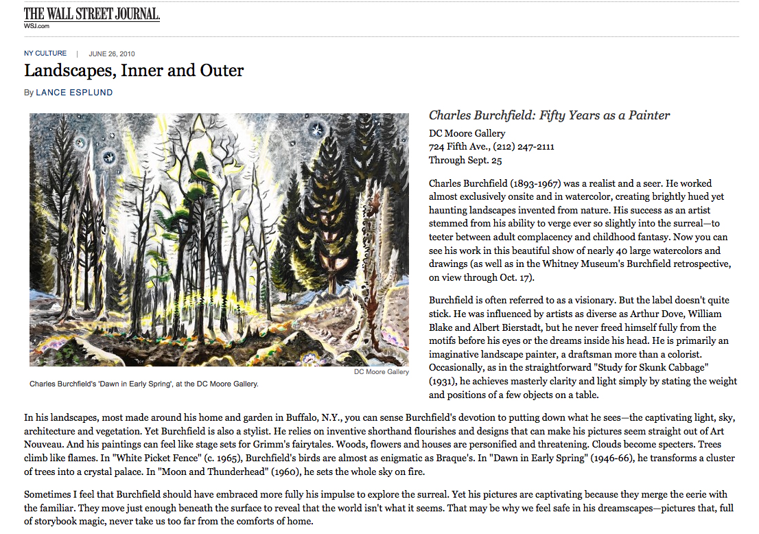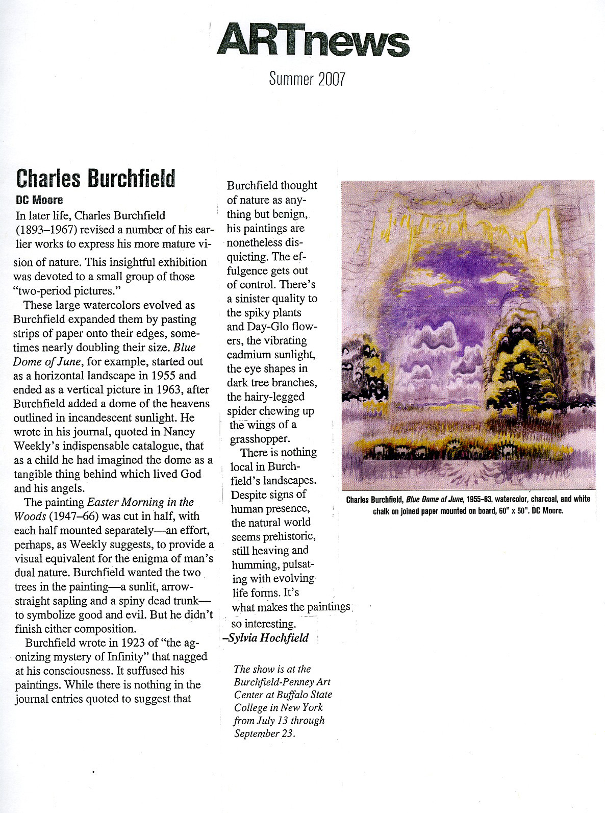Charles Burchfield has been the focus of numerous  museum exhibitions, including an exhibition of early watercolors at the Museum of Modern Art in 1930, and retrospectives at the Albright-Knox Gallery in Buffalo in 1944, the Whitney Museum of American in 1956, 1980 and 2002, the University of Arizona Art Gallery, Tucson in 1965, the Metropolitan Museum of Art in 1990, and the Columbus Museum of Art in Ohio in 1997. The latter exhibition, titled The Paintings of Charles Burchfield: North by Midwest, traveled to the Burchfield-Penney Art Center in Buffalo, New York and the Smithsonian’s National Museum of American Art in Washington, D.C. and was accompanied by a monograph by Nannette Maciejunes and Michael Hall. Burchfield’s work is represented in every major collection of American art in this country.