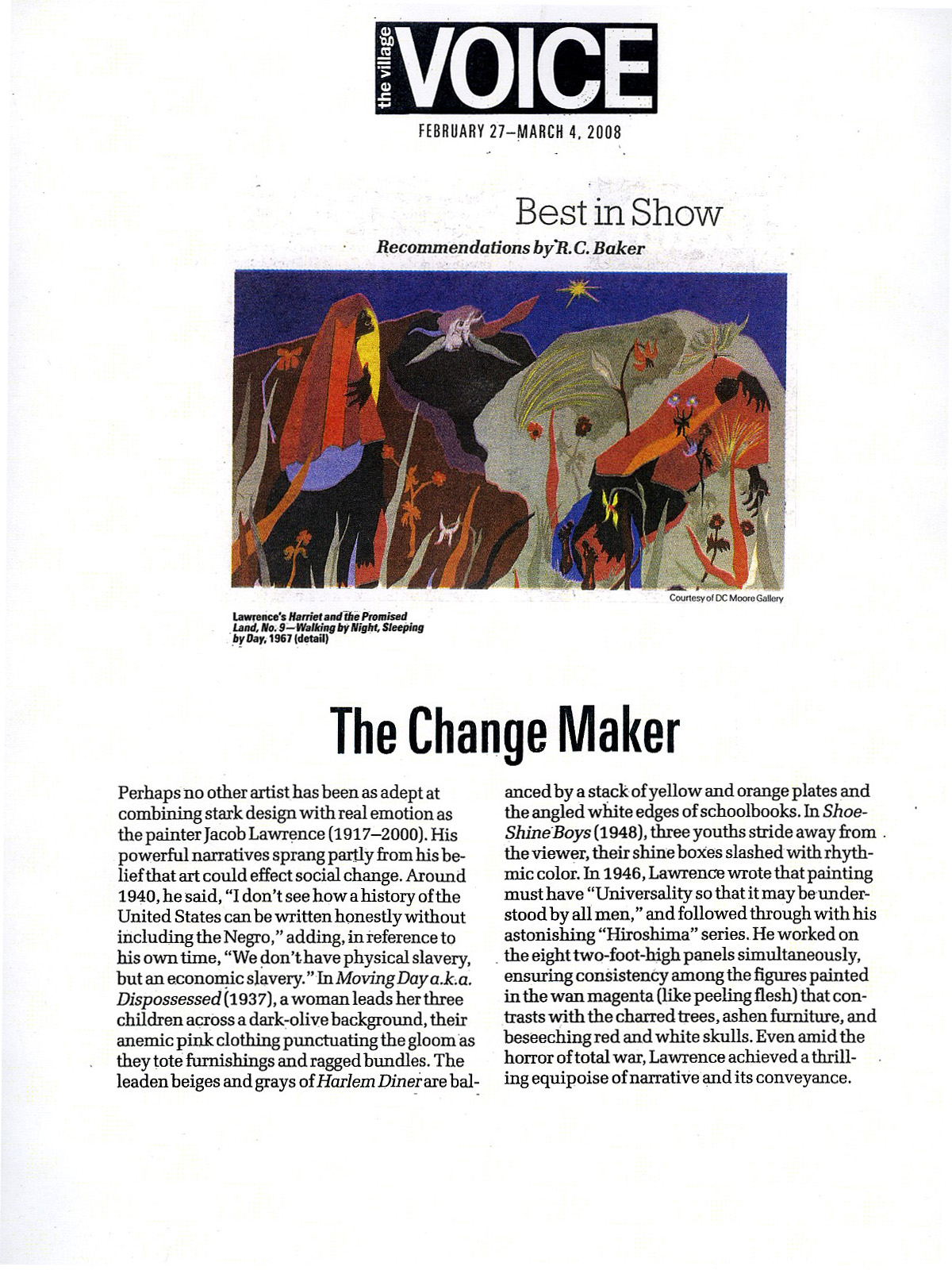 Major traveling exhibitions of Lawrence’s work have been presented in museums across the country. The Metropolitan Museum of Art, New York recently exhibited Lawrence's rarely-seen 1954-56 Struggle Series paintings in the exhibition, Jacob Lawrence: The American Struggle, which is traveling to museums throughout the country. Other recent exhibitions include One Way Ticket: Jacob Lawrence’s Migration Series at The Museum of Modern Art in New York (2015) and Between Form and Content: Perspectives on Jacob Lawrence and Black Mountain College at The Black Mountain College Museum and Arts Center in Asheville, NC (2018–19). He has also been the focus of Jacob Lawrence: American Painter, organized by the Seattle Museum of Art; Jacob Lawrence: The Frederick Douglass and Harriet Tubman Series of 1938-40, organized by the Hampton University Museum in Virginia; and Jacob Lawrence’s The Migration Series, organized jointly by the Phillips Collection in Washington, DC and the Museum of Modern Art in New York. A major retrospective exhibition Over the Line: The Art and Life of Jacob Lawrence originated in 2001 at the Phillips Collection in Washington, DC and traveled to the Whitney Museum of American Art, the Detroit Institute of Arts, the High Museum of Art in Atlanta, GA, the Museum of Fine Arts in Houston, Texas, and the Seattle Art Museum.